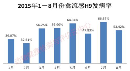 进入2015年禽流感H9的发病率一路飙升,虽然8月份禽流感发病率较7月份有所下降,但发病率依然占据很大的比例。同时根据检测云中心对临床数据的统计分析发现,第一鸡群感染禽流感H9后,疾病所带来的损失加大,如平均死淘率升高,个别病例死淘率日可达到2%;产蛋率波动幅度较大,开产鸡群产蛋率不上升,严重的产蛋率下降,高者可下降10%左右。第二、禽流感H9成为养殖场的隐性杀手,当与其它疾病一起感染时,不易被诊断出来,如鸡群长期腹泻久治不愈,虽然临床和剖检看不到H9感染迹象的存在,当用实验室检测技术进行检测时就会发现,肠炎久治不愈的原因与H9有很大的关系。第三由于禽流感H9持续感染的存在,有些鸡群从环境中获得了被动免疫,体内的抗体水平、体质和环境中的病毒攻击力达到一定平衡,这样的鸡群没有明显的临床症状,但当鸡群受到外界应激时即平衡被打乱,极易发病,且治愈难度较大。基于以上情况对于禽流感H9的防控应从免疫、管理、生物安全等方面入手,制定一个全方位的防控计划。