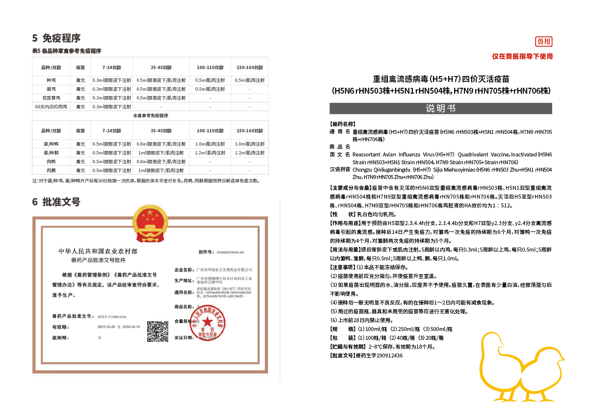 重组禽流感病毒(H5+H7)四价灭活疫苗(H5N6 rHN503株+H5N1 rHN504株,H7N9 rHN705株+rHN706株)